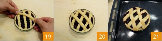 Apply the shortcrust pastry strips on the mini tarts to create a decorative lattice pattern 19. Once finished 20, bake in a preheated static oven at 340°F for 40 minutes (or in a ventilated oven at 300°F for 30 minutes). When ready, take them out of the oven 21, let them cool completely on a wire rack, then remove from the molds. Finally, serve and enjoy your mini tarts with frangipane cream and cherry jam.
