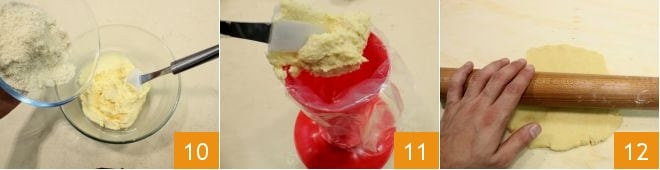 Scrape down the sides with a spatula and finally add the almond flour 10, then put the cream in a piping bag without a nozzle, placing it in the refrigerator 11. After the necessary time, roll out the shortcrust pastry with a rolling pin to a thickness of about 0.4 inches 12.