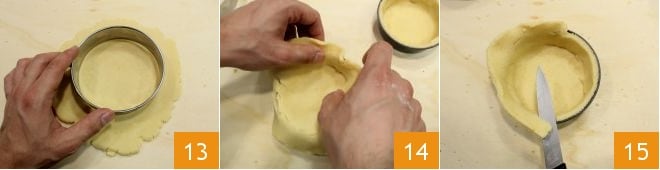 With a pastry cutter 5.5 inches in diameter, cut out 4 disks 12 and line 4 non-stick round molds, previously buttered and floured, of the size of 4 inches in diameter and with a rim 1.2 inches high 14; press lightly with your fingers on the bottom and sides to adhere the dough well, then with a small knife, trim the excess dough, saving the leftover dough 15. If you want to make a single tart, you can use a mold with a diameter of 11 inches with a rim 1.6 inches high.