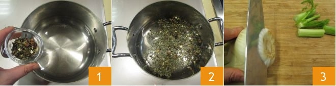 To make the tea steamed cod, first place a pot full of water on the stove, add the dried lemon tea leaves (1-2) and bring to a boil. Meanwhile, take the fennel and cut off the bottom part 3,