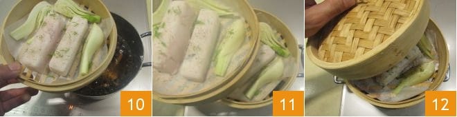 Place the bamboo baskets one on top of the other over the pot where the water with the tea infusion is boiling (10-11), cover with the appropriate lid 12, and let cook over medium heat for 15 minutes.