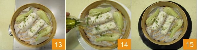 When cooking is complete 13, dress with a drizzle of raw olive oil 14, then serve the tea steamed cod hot 15 accompanied by the fennel.