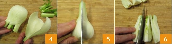 remove the first outer tough leaf 4, then cut the core in half 5, and divide each half into 3 wedges 6. Keep the thin green fronds aside for cooking.