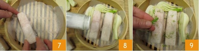 Now take a bamboo steamer basket, line the base with a piece of parchment paper. Place the cod 7 and the fennel wedges, season with salt 8 and pepper, and finally distribute the green fennel fronds on top 9. Now take a second bamboo steamer basket and repeat the same operations.