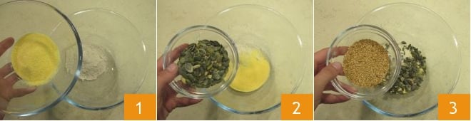 To prepare the teff crackers, first pour the water into a saucepan and heat it. In the meantime, take a large bowl and pour in all the dry ingredients: the teff flour, cornmeal 1, pumpkin seeds 2, flax seeds 3,