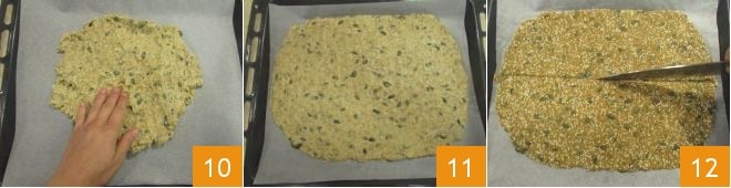 Line a baking sheet with parchment paper and spread the dough with your hands 10 to form a rectangle about 1-2 mm thick 11. Bake in a static oven preheated to 300°F for 25 minutes, placing the tray on the lower rack of the oven. After this time, remove the tray from the oven and cut the rectangle with a sharp knife, first in half horizontally 12, then vertically to get 10 smaller rectangles.
