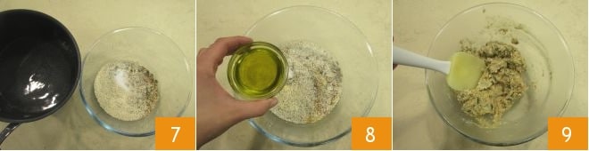 When the water is hot, add it to the mixture 7 and also add the oil 8. At this point, mix with a spatula or spoon to combine all the ingredients 9 until you get a soft dough.