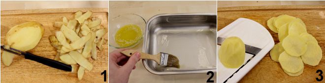 To prepare the baking dish of roasted potatoes, start by peeling the potatoes 1, then rinse them under running water and dry them thoroughly. Mix the oil with the melted butter in a small bowl and use this mixture to grease an ovenproof dish 2 (we used a rectangular one measuring 8x10 inches). At this point, use a sharp knife or a mandoline to cut the potatoes into slices about 1/16 inch thick 3.