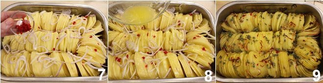 Place the slices vertically in a row in the baking dish 4 (take ten at a time so that they will stand upright), forming 3 rows of potatoes inside it 5. Cut the shallots into slices and place them in the empty spaces between the potatoes 6,