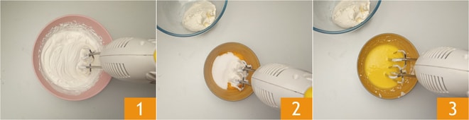 To prepare the tiramisù with whipped cream, first make the coffee and let it cool completely. In a bowl, pour in the egg yolks (preferably pasteurized), then add the sugar 1 and beat with an electric mixer for about ten minutes 2, until you obtain a light and frothy mixture 3.