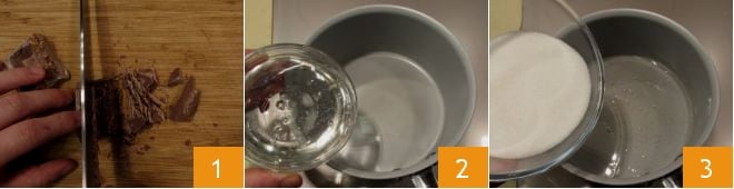 To make the toffee candies, chop the milk chocolate 1, then in a non-stick saucepan, pour the glucose 2 and the sugar 3, turn on the heat, and stir gently.
