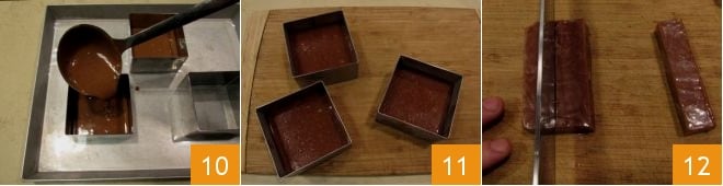 Place 3 square pastry rings 3x3 inches on a tray lined with parchment paper (or baking paper) and fill each with the mixture, using a ladle 10. At this point, place the tray in the refrigerator for 3 or 4 hours, so the mixture solidifies. After this time, transfer the toffee molds to a cutting board 11 and gently remove the mold. Cut the mixture first into lozenges 12,