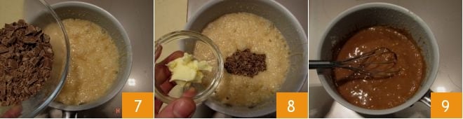 Once the mixture has reached the necessary temperature, add the previously chopped milk chocolate 7 and the butter 8. With the hand whisk, thoroughly mix all the ingredients to obtain a homogeneous and smooth mixture 9.