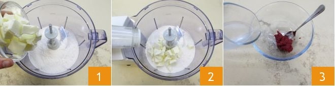 To prepare the savory tomato pie with stracciatella, start with the shortcrust pastry. Take a blender and add flour, cold butter from the fridge cut into small pieces 1, and adjust with salt 2. Blend until you get a sandy and floury mixture. Take a small bowl, pour in the tomato paste and cold water 3.