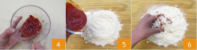Then mix until the tomato paste is completely diluted 4; pour the flour and butter mixture onto a work surface (or a metal or glass surface, as long as it is cold) and create a well in the center. Pour the diluted paste 5 and knead vigorously with your hands 6.