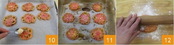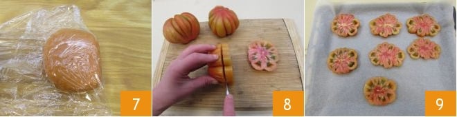 When you have a compact, firm, and fairly elastic dough, create a loaf, wrap it with clear plastic wrap 7, and let it rest in the fridge for at least 40 minutes. Meanwhile, prepare the caramelized tomatoes. Rinse the tomatoes under plenty of running water, then cut them into slices about 0.75 inches thick 8 and place them on a baking sheet lined with parchment paper next to each other 9.