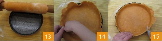 Then take a 10-inch diameter pie pan, butter and flour it. Wrap the tomato shortcrust pastry around the rolling pin and gently unroll it onto the pan 13. Press it well into the bottom and sides of the pan, ensuring you apply light pressure with your fingers on the edges 14; use a knife to trim the excess shortcrust pastry edges 15.