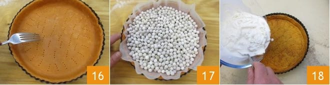 Prick the bottom with a fork 16, then proceed with How to do blind baking place a sheet of parchment paper over the shortcrust and place ceramic balls (or dried legumes) on top 17. Bake in a preheated static oven at 392°F for 25 minutes (it is not advisable to use a fan-assisted oven). Once ready, take it out, let it cool slightly, and remove the balls, then let it cool in the pan. Add the stracciatella 18, spreading it evenly across the entire surface of the pie pan, using a spatula to level it.