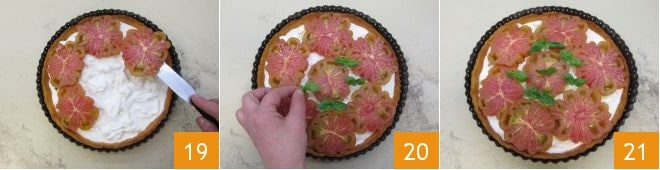 Arrange the tomato slices next to each other in a concentric shape until the entire surface of the savory pie is filled 19; decorate with basil leaves 20, and finally enjoy the savory tomato pie with stracciatella 21!