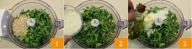 Meanwhile, prepare the pesto: after washing and drying the arugula well, transfer it to a blender, to which you add the pine nuts 1, salt, garlic, Grana Padano DOP 2, and half the amount of olive oil 3.