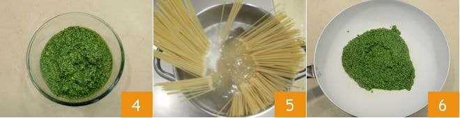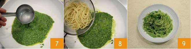 When the pasta is al dente, before draining it, mix the pesto with a ladle of cooking water 7. Then drain the pasta and sauté it for a few moments in the arugula pesto over high heat 8.