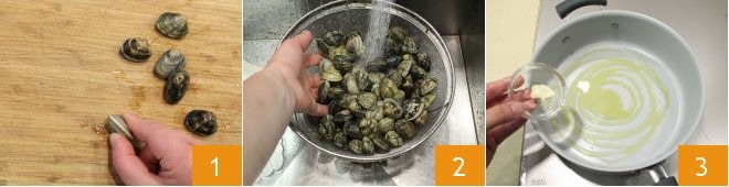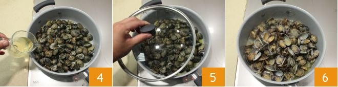 Transfer the clams to the pan, pour in the white wine 4 and let it evaporate, then cover with the lid 5 and turn the heat to high: this way the shells will open with the heat 6.