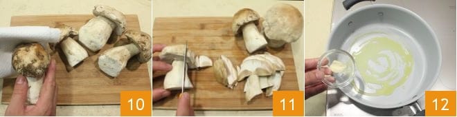 then take care of the How to Clean Porcini Mushrooms: With the help of a sharp knife with a smooth blade, begin to eliminate the earthy part on the stem by scraping it gently until any trace of earth is removed. If the mushroom is fairly clean, remove the few remaining earth residues with a cotton cloth 10. Slice the mushrooms 11, they should be about 1/4 inch thick. Place a wide pan on the heat, brown a garlic clove with a drizzle of olive oil 12, before proceeding with adding the other ingredients, remove the garlic which will have released its aroma,
