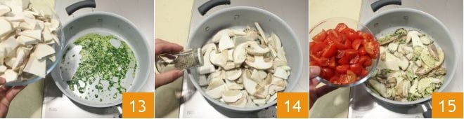 add the chopped parsley and sliced porcini mushrooms 13, salt and pepper 14, then cook for a couple of minutes; also add the cherry tomatoes 15,
