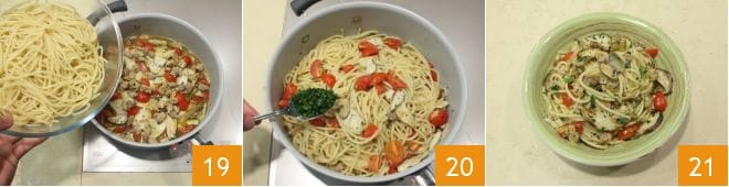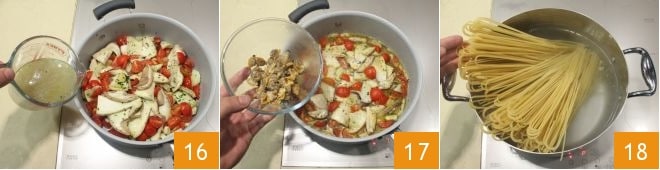 pour in the clam cooking water 16 and cook for about 10 minutes, then turn off the heat and incorporate the clams 17. Meanwhile, place a pot with plenty of salted water on the heat and bring it to a boil, then add the tonnarelli 18 and cook for the time indicated on the package.