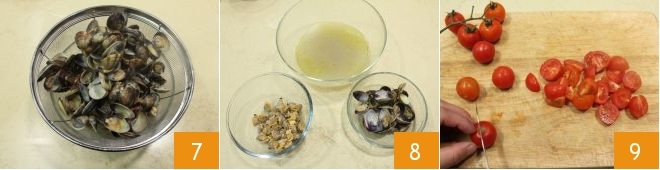 Drain the clams 7 and preserve the cooking liquid that has formed. Shell them, making sure to keep some whole for plate decoration 8. Wash the cherry tomatoes and cut them into quarters 9,