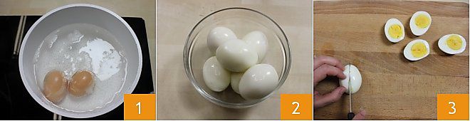To prepare the egg mice, place the eggs in a saucepan with water over medium heat 1. As soon as the water reaches a boil, let them cook for 8 minutes. Cool them under cold water, then peel them gently, being careful not to damage the smooth surface of the egg 2. Cut the eggs in half lengthwise 3.
