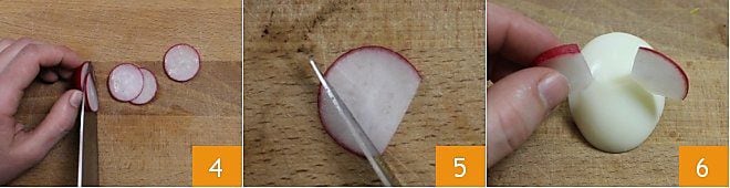 Wash and clean the radishes and cut them into thin slices 4. Use a small knife to remove the lateral parts, forming a triangle with a rounded base 5. Make cuts in the egg where you will position the radish slices to form the ears 6.