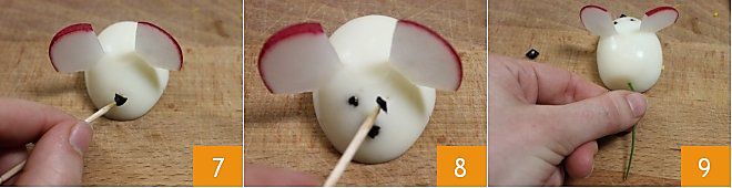 With a toothpick, make a hole in the center of the egg and insert a piece of olive, thus forming the nose 7. Slightly above, make two small holes and insert two smaller pieces of olive than the nose; these will be the eyes 8. Now form the tail of your mouse, making a small hole with the toothpick and then inserting a chive stem 9.