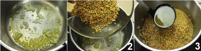 To prepare the torcelli with lentil cream and guanciale, start by sautéing the finely chopped onion in the oil 1. When the onion is softened, add the raw lentils 2 and let them absorb the seasoning for a moment. Now, cover the lentils with the broth 3 and cook on low heat for 40-45 minutes,