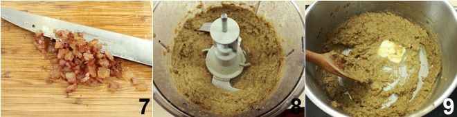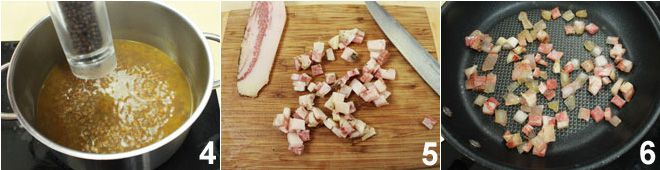 On a cutting board, cut the guanciale into cubes 5 and brown them in a non-stick pan 6 (do not add oil).