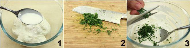 Start preparing the cream by placing the ricotta in a large bowl, then incorporate the heavy cream 1, just enough to slightly soften it, and mix well. Prepare a mixture with parsley 2, thyme, and marjoram and add it to the ricotta cream, also add the chives 3.