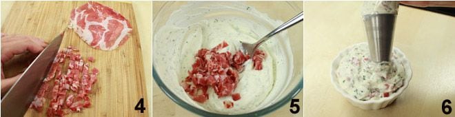 Cut the capocollo slices into small squares 4 and incorporate them into the ricotta and herb cream 5. Adjust the salt and add white pepper to taste.
