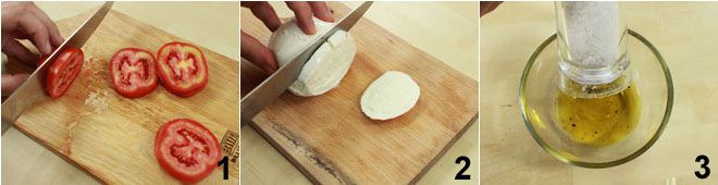 Slice the tomato 1 and mozzarella into rounds. Further divide each slice of mozzarella into 4 parts, making sure they are the same size as the tomato slice 2. In a small bowl, mix the oil with salt and pepper well 3.