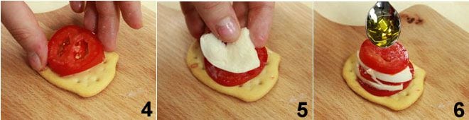 Now place a slice of tomato 4 on 'La Bottega di Olivia&Marino' flatbreads, then a slice of mozzarella 5 and repeat the same operation once more; close everything with a slice of tomato. Then drizzle a little oil on each tower 6. Secure the tower with a toothpick or a small wooden skewer and decorate on top with two basil leaves.