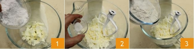In the bowl of a stand mixer, add the cold cubed butter, mix in the granulated and powdered sugar already combined 1, add the salt 2, and mix with the paddle attachment until you get a crumbly mixture. At this point, add the sifted flour 3 and mix for a few more seconds to combine it with the rest.