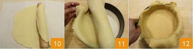 Lightly butter a 10-inch diameter tart pan with a high bottom; remove the parchment paper covering the disc, gently roll the shortcrust pastry disc onto the rolling pin 10 and gently unroll it onto the tart pan 12, pressing the edges and bottom 12.