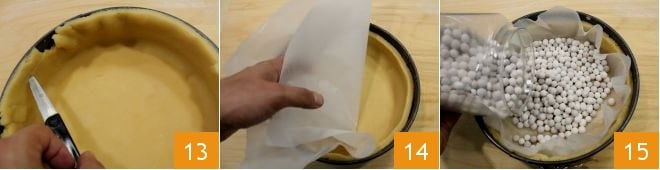 Trim the edges with a knife blade 13, leaving them about 1 inch high. Then prick the bottom with the prongs of a fork and place a disc of parchment paper 14 on which to position the weights for blind baking the base 15: bake the shortcrust pastry in a preheated static oven at 330°F for 40-50 minutes (310°F for about 30-40 minutes if using a fan oven).