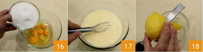In the meantime, focus on the cream: in a bowl, gradually pour in the eggs and sugar (three additions will be fine) 16, whisk by hand until you get a light and frothy mixture 17; grate the zest of six lemons (with the zest-free lemons, you can make fresh lemonade) 16.