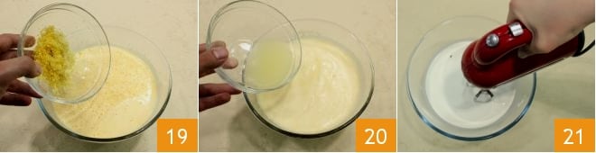 Add it to the mixture 19 along with the strained juice of two lemons 20. Separately, work the fresh liquid cream with an electric mixer to achieve a "thickened" consistency (it should remain very creamy) 21;
