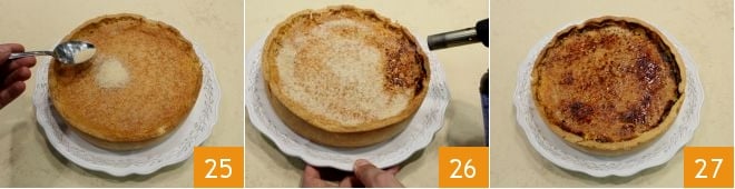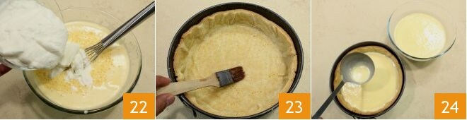 Add it to the egg and sugar mixture 22 and mix with a whisk. Cover with contact plastic wrap and refrigerate to firm up for at least 40 minutes. When the brûlée cake base is cooked, take it out of the oven and let it cool slightly, then brush the bottom with egg white 23 and return to the oven at the same temperature for a few minutes until it dries and colors. Then remove the shortcrust pastry from the oven and pour the cream into the cake using a ladle 24, then return to the oven at 260-265°F for about 150 minutes (if using a fan oven at 240-250°F for 130 minutes). The time varies depending on how long you let the filling rest in the refrigerator; the colder it gets, the longer it will take to cook.
