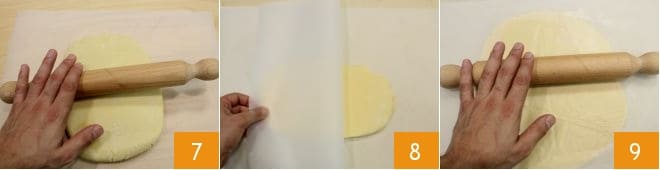 After the necessary time, you can take the dough back, then place it on a sheet of parchment paper and roll it out slightly with a rolling pin 7. Then place another sheet of parchment paper 8 and finish rolling out the dough to form a disc about 1/4 inch thick 9.