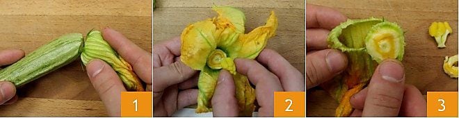 To prepare the zucchini and their flowers pie start by taking the zucchini flowers: remove the stem 1, the central pistil 2, and cut off the end of the flower 3.