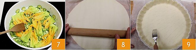 Now add the zucchini flowers 7, mix for a few seconds and turn off the heat. Take the puff pastry and roll it out slightly with a rolling pin 8. Place the pastry in a previously buttered mold and prick it with the tines of a fork 9.