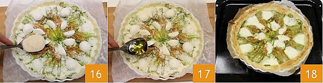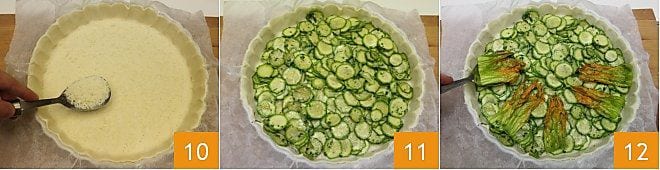 Sprinkle the pastry in the mold with 50 g of Grana Padano 10. Then pour the zucchini 11 and the flowers (which you can arrange in a radial pattern) 12.