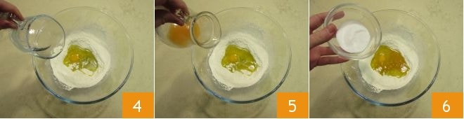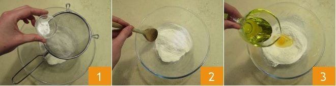 To prepare the flaó cake, start with the base: squeeze the orange juice needed for the recipe and set aside. Sift flour and baking powder into a bowl 1, mix them 2 and form a well in which to pour the egg and oil 3.